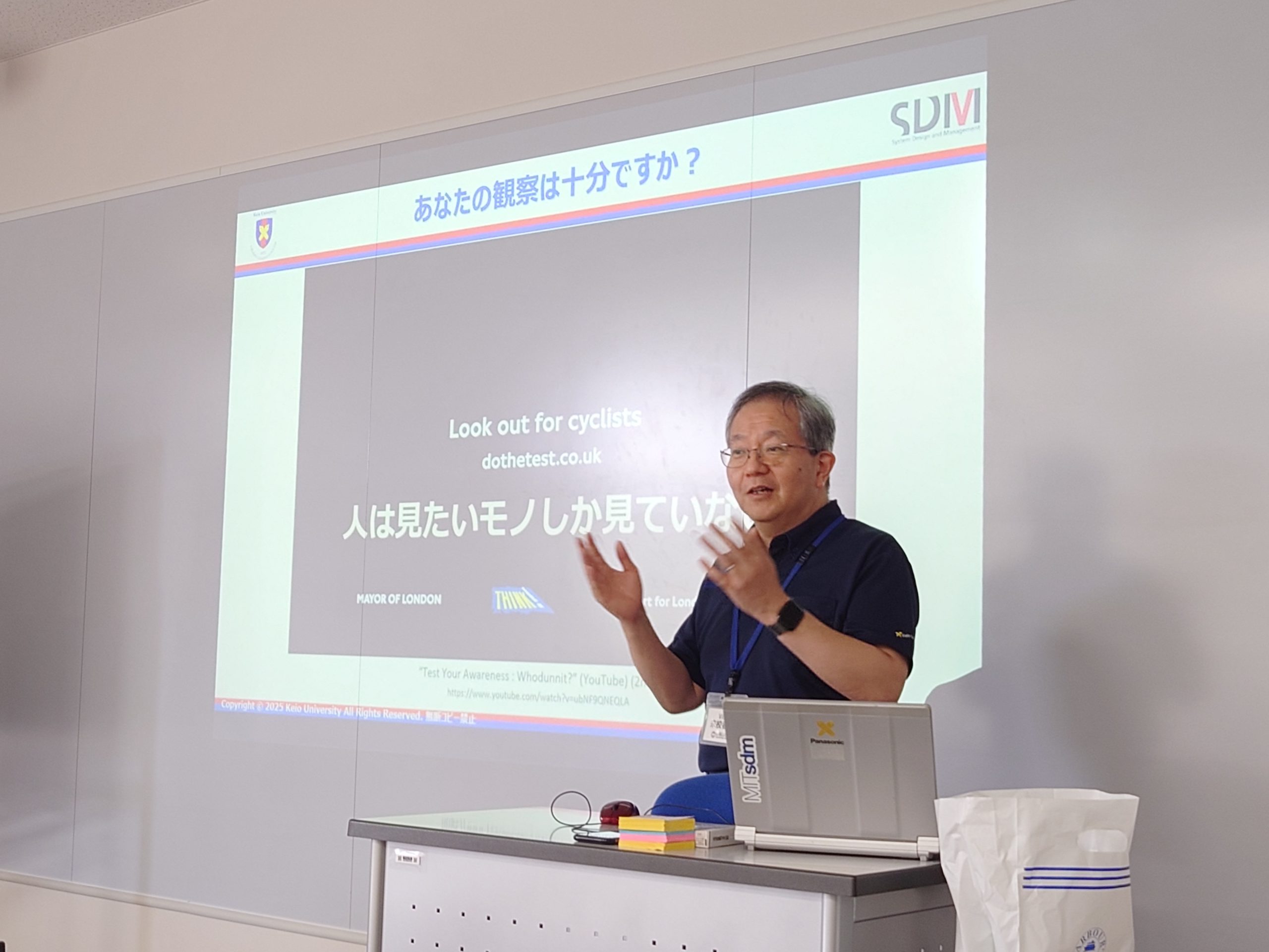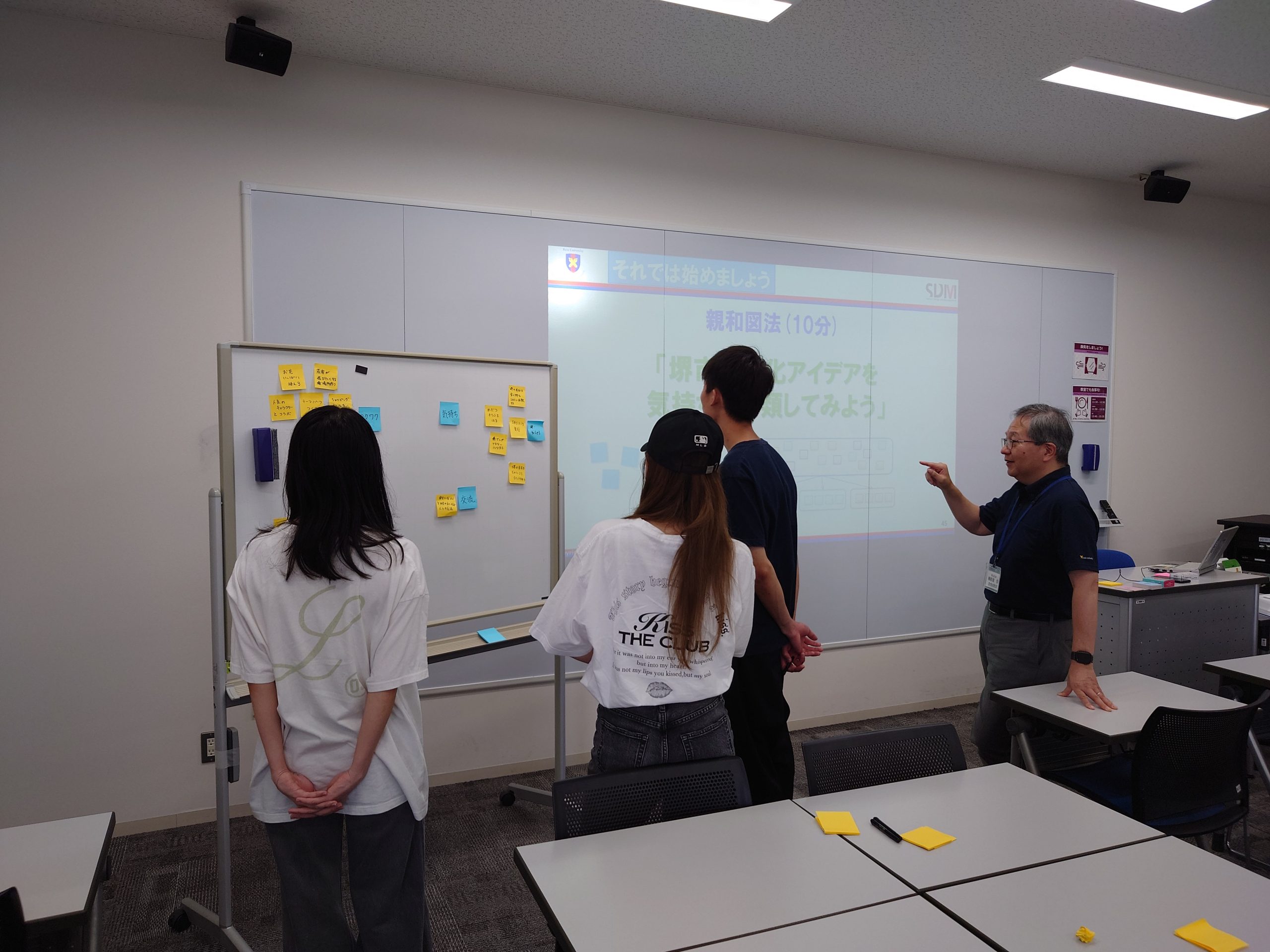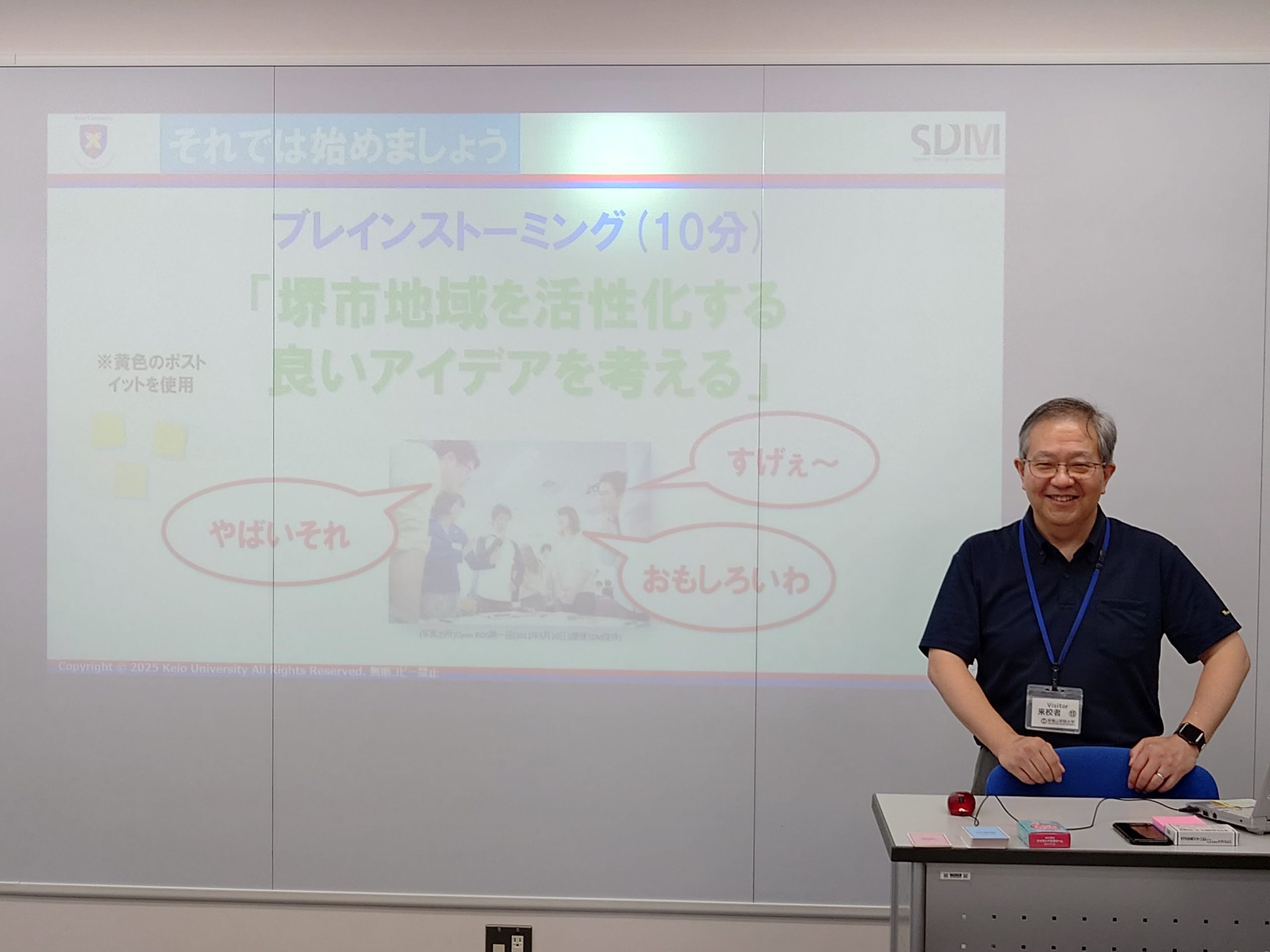 先生は、日米の3Mで新製品開発に従事され、そのプロジェクトマネジメントの経験を基に、地域コミュニティのコミュニケーションデザインなどに取り組んでおられ、講義では、学際分野の研究プロジェクトの進め方や実際の地域研究事例についてお話があった後に、実践的研究プロジェクトは現場観察が大切ということを踏まえて、地域活性化をテーマにアイデア創出ワークショップを実施しました。
