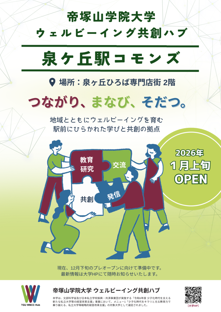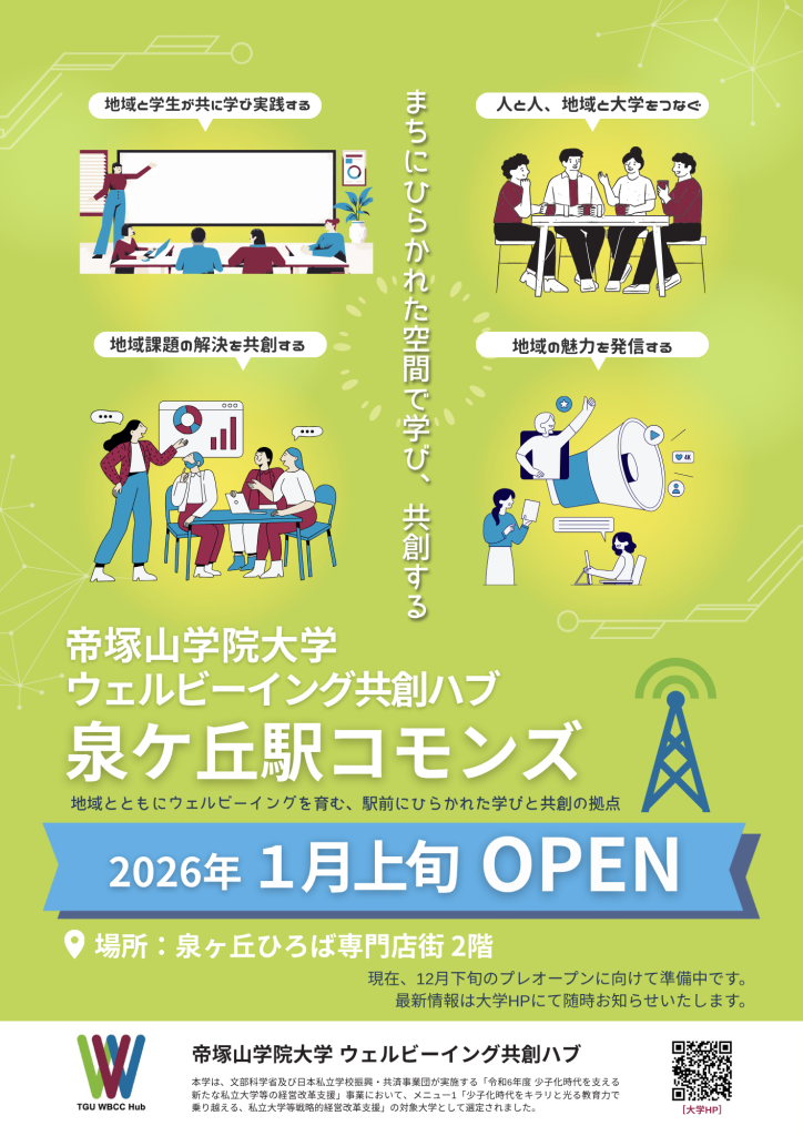 2025年4月に開設した「帝塚山学院大学 ウェルビーイング共創ハブ」の学外拠点として、泉ヶ丘ひろば専門店街2階に「泉ケ丘駅コモンズ」をオープンします。