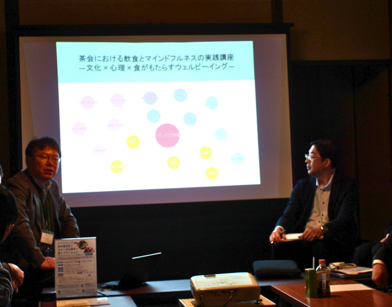 第一部では、さかい利晶の杜 茶の湯コンシェルジュ・宮本雅代様による「堺の茶の湯文化」についてのご講演に続き、本学食環境学部の渡邉晃弘教授より「和菓子のしくみ」、総合心理学部の大本浩司教授より「スイーツ心理学®」および「マインドフルネスイーティング」についての講義が行われました。第一部の最後には、参加者全員でレーズンを用いたマインドフルネスイーティングを実践し、五感を研ぎ澄ませながら「味わうこと」「心を整えること」の豊かさを体感しました。