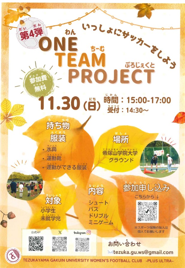 2025年11月30日(日)、本学女子サッカー部主催の小学生以下を対象としたサッカー体験教室「わんちーむぷろじぇくと〜ONE TEAM PROJECT〜」第4弾が、本学グラウンドにて開催されます。