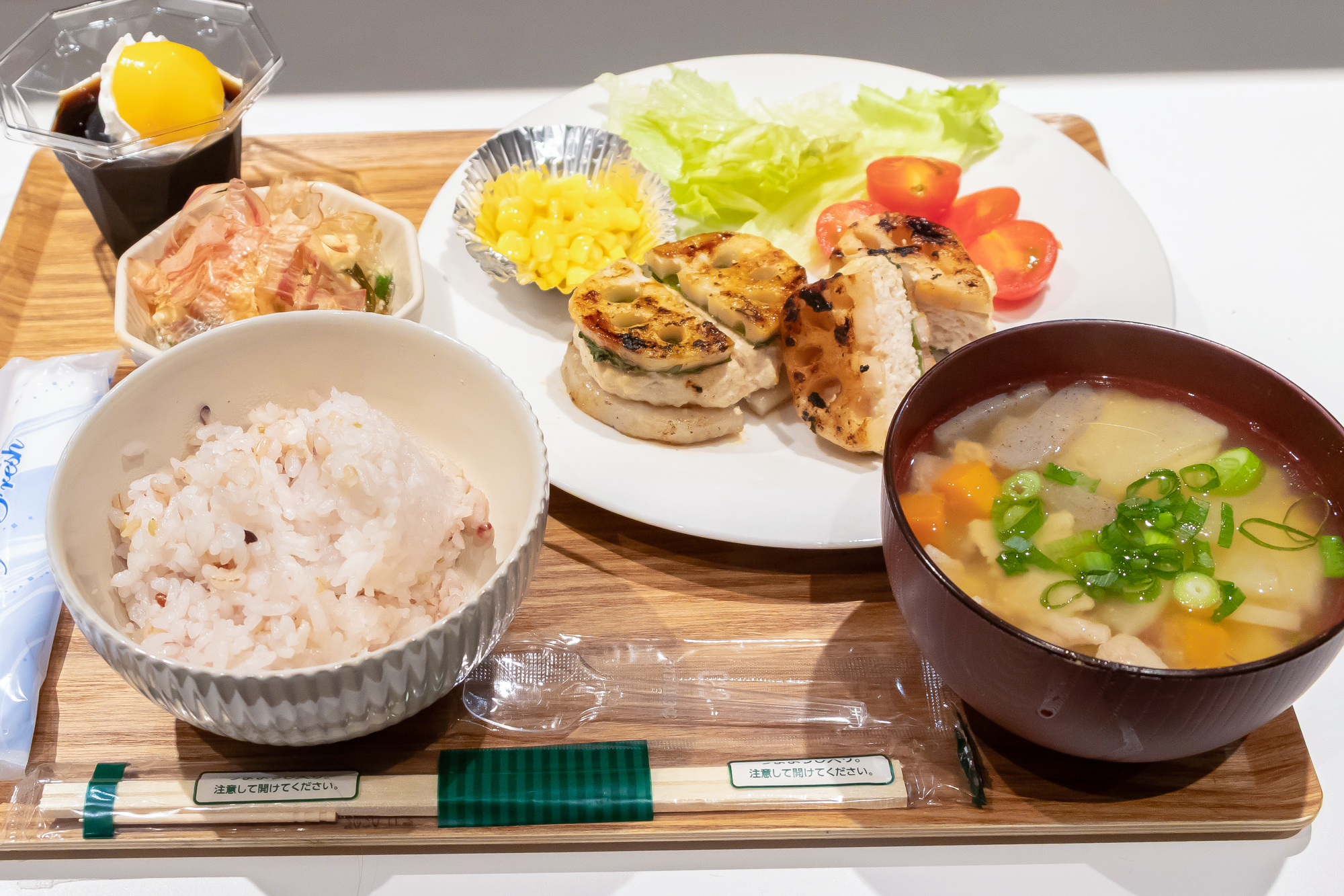 旬の食材を使用し、野菜たっぷりで具沢山の豚汁や、脂質・塩分を控えたれんこんとつくねのはさみ焼き、ヘルシーな献立で、栗をトッピングしたコーヒーゼリー付きで提供価格は500円。
