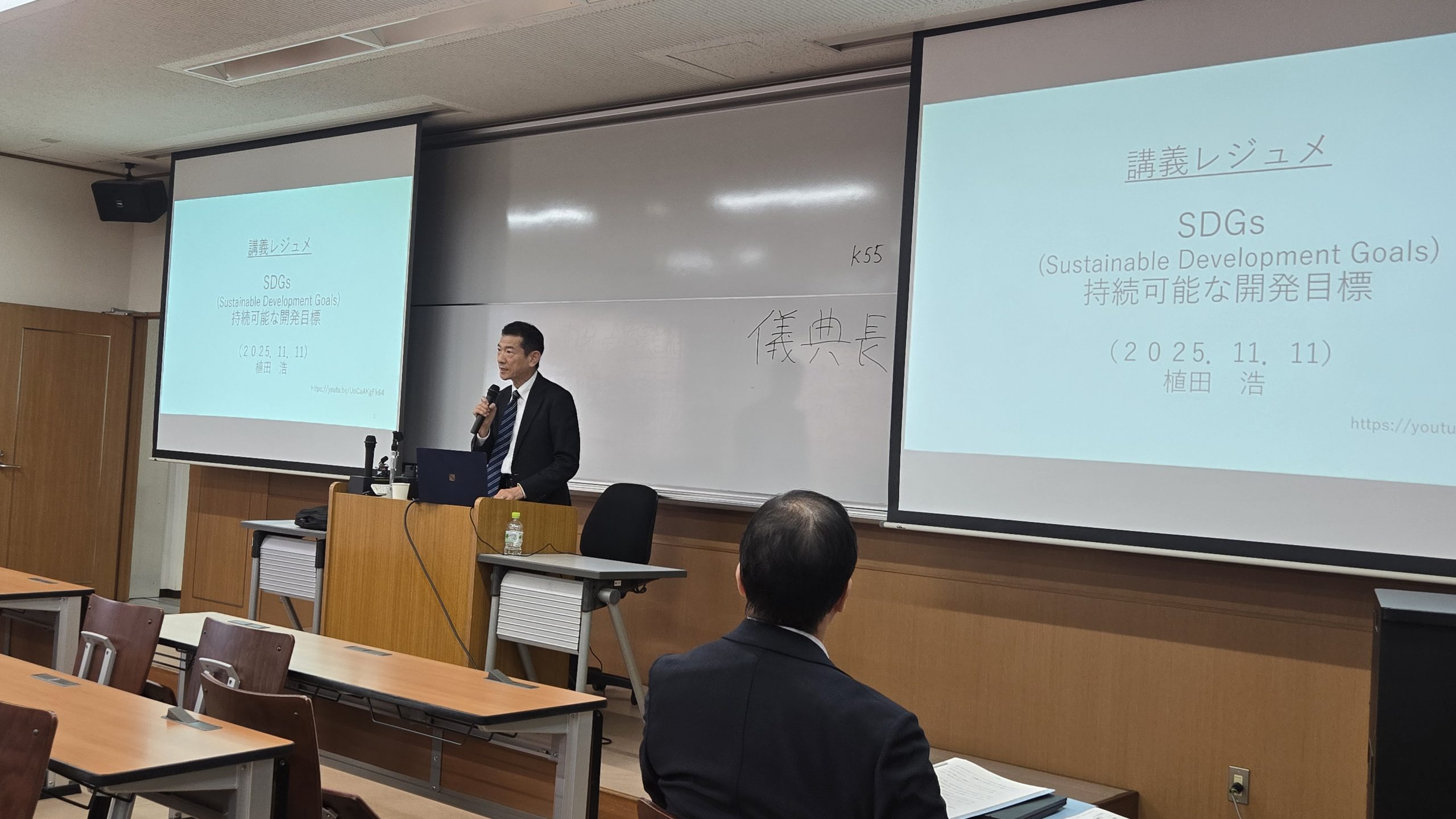 11月11日(火)に行われたリベラルアーツ学科専門科目「社会デザイン論」(大島裕市准教授・原邊祥弘専任講師)の授業において、植田浩客員教授(現大阪府・大阪市儀典長/元駐ルーマニア特命全権大使)をお招きし、世界および日本の社会問題をテーマに、「SDGs(Sustainable Development Goals)持続可能な開発目標」についてご講義いただきました。
