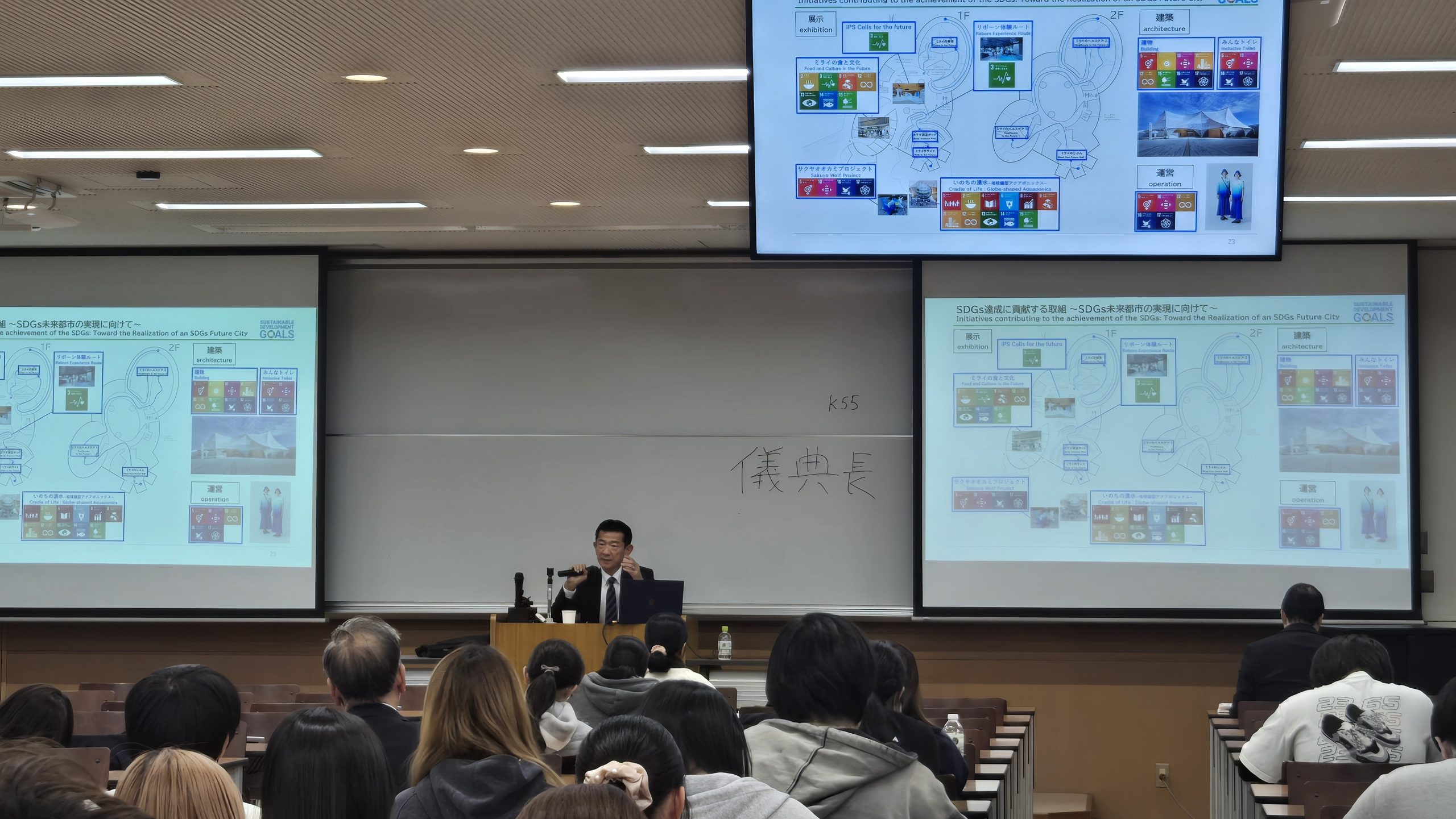 講義では、SDGsがミレニアム開発目標を引き継ぎ、2015年9月に国連で採択された17の目標であること、さらに2025年7月に公表された国連年次報告書における目標達成状況についてご説明いただきました。加えて、日本のSDGs実施指針や、大阪府・市が2030年の目標年次に向けて進めている具体的な取り組みをご紹介いただきました。