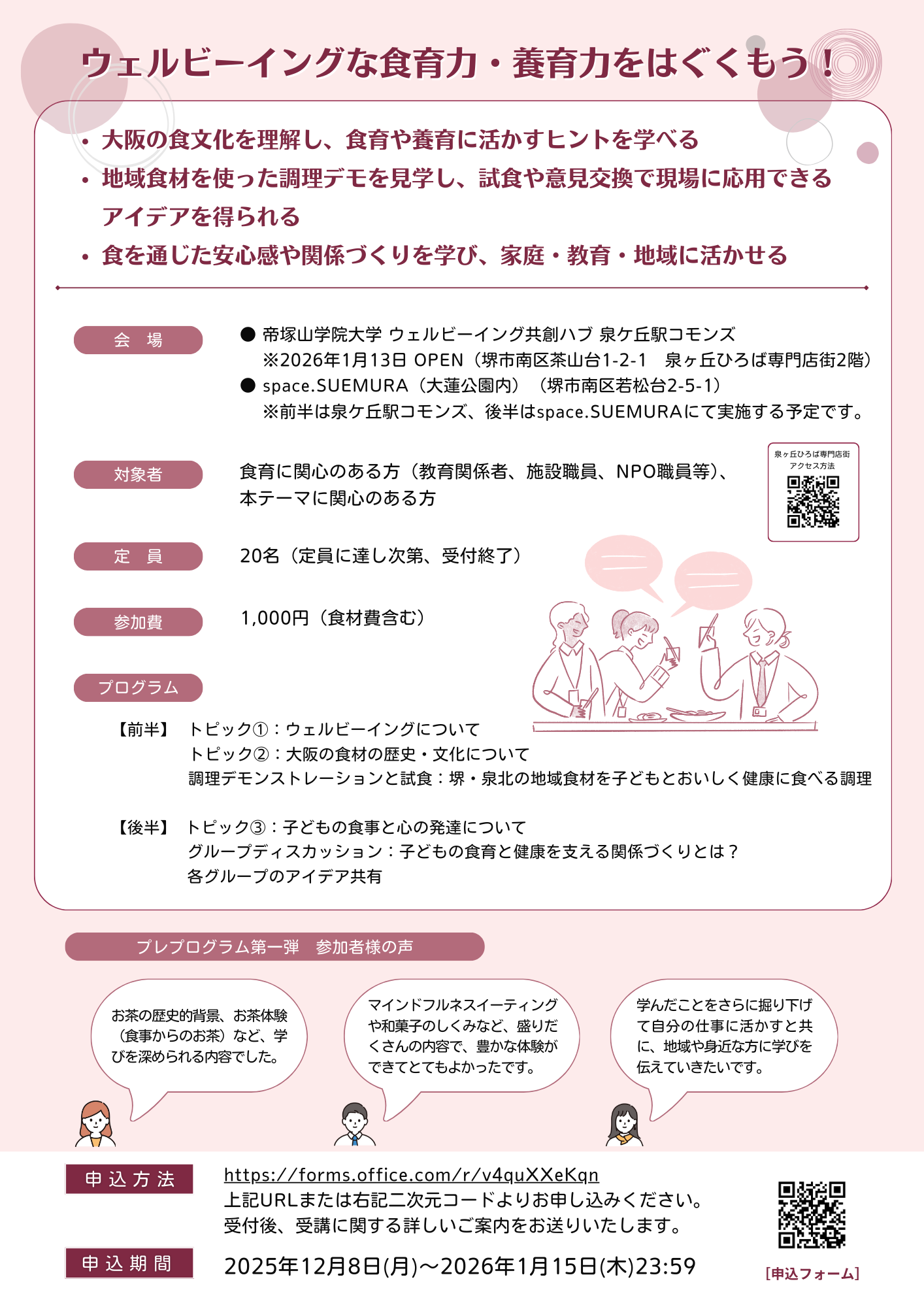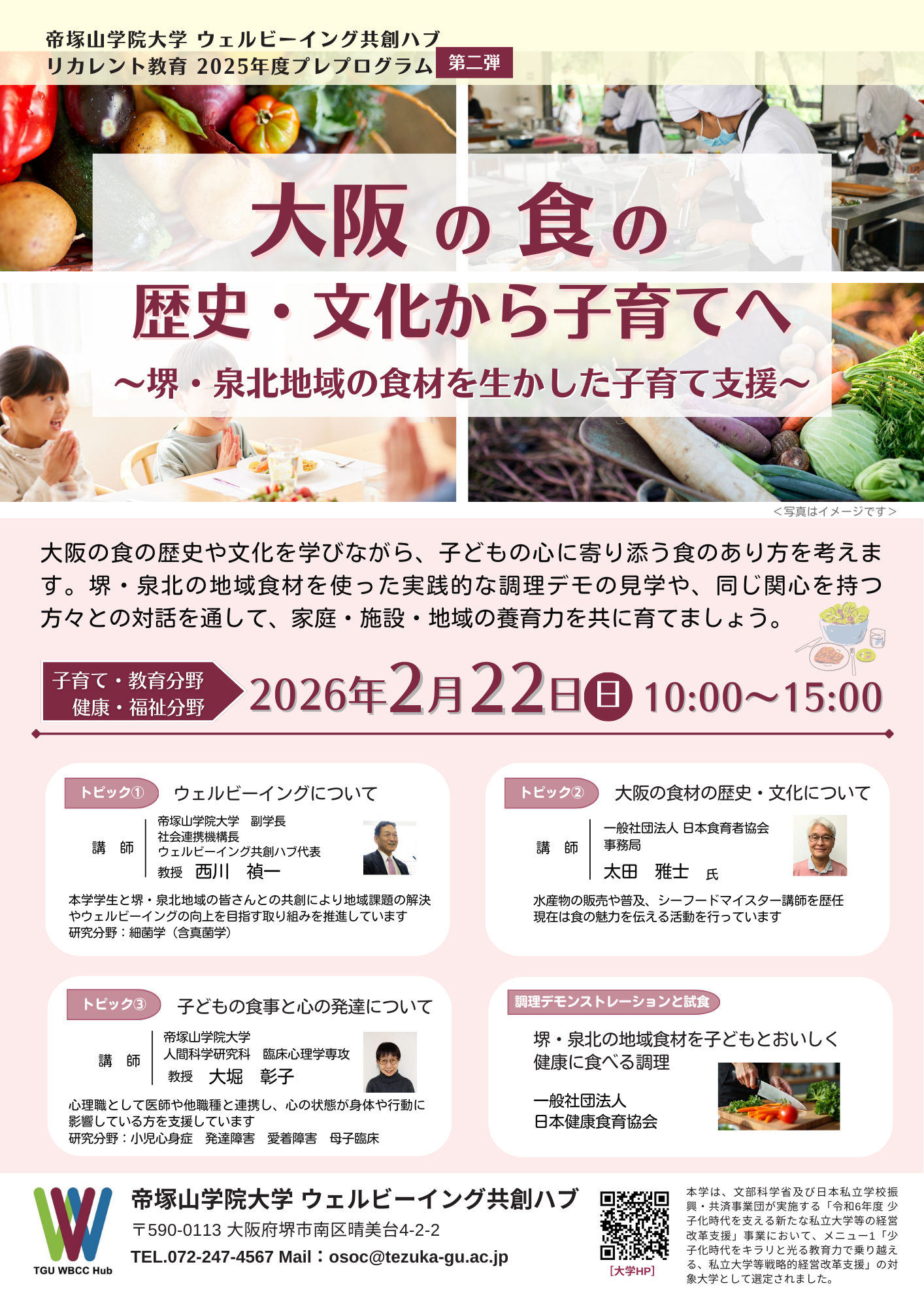 帝塚山学院大学ウェルビーイング共創ハブでは、2026年度より<健康・福祉><子育て・教育><地域経営>の3分野に注力した、地域社会のウェルビーイング向上に資するリカレント教育の本格実施を予定しています。それに先駆け、2025年度2月にプレプログラム第二弾を実施します。みなさまのご参加をお待ちしています。