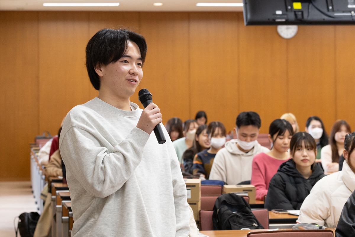 講義の最後には、「小さな行動が未来を変える。挑戦する一歩を踏み出そう」と、在学生へ力強いエールが送られました。終了後も多くの学生が谷先生を囲んで質問を続けるなど、講義は大変盛況でした。
