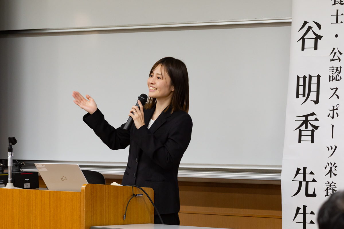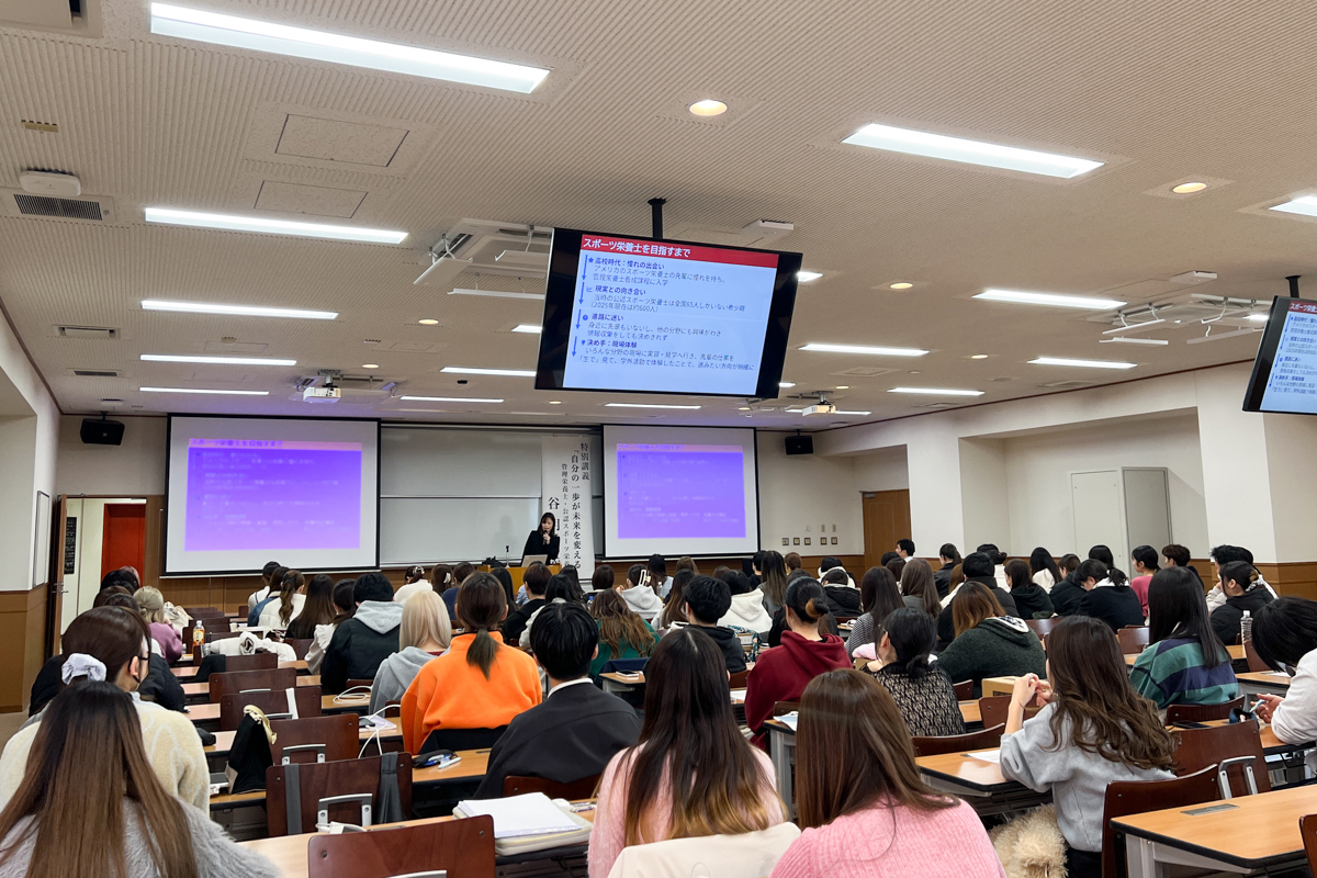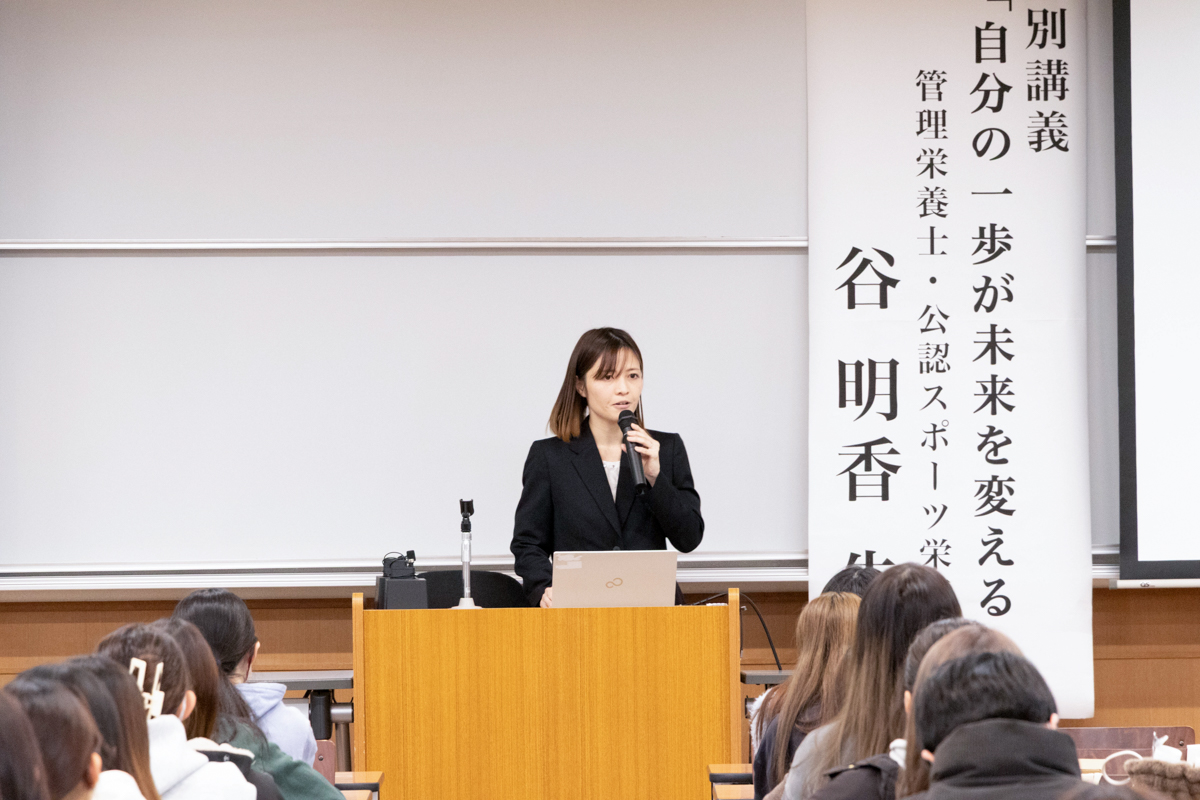 12月3日(水)、管理栄養学科2回生を対象とした「基礎演習Ⅳ」において、本学卒業生であり2024年度末時点で全国で557名しかいない公認スポーツ栄養士として活躍されている谷明香先生をお迎えし、特別講義「自分の一歩が未来を変える」を実施しました。
