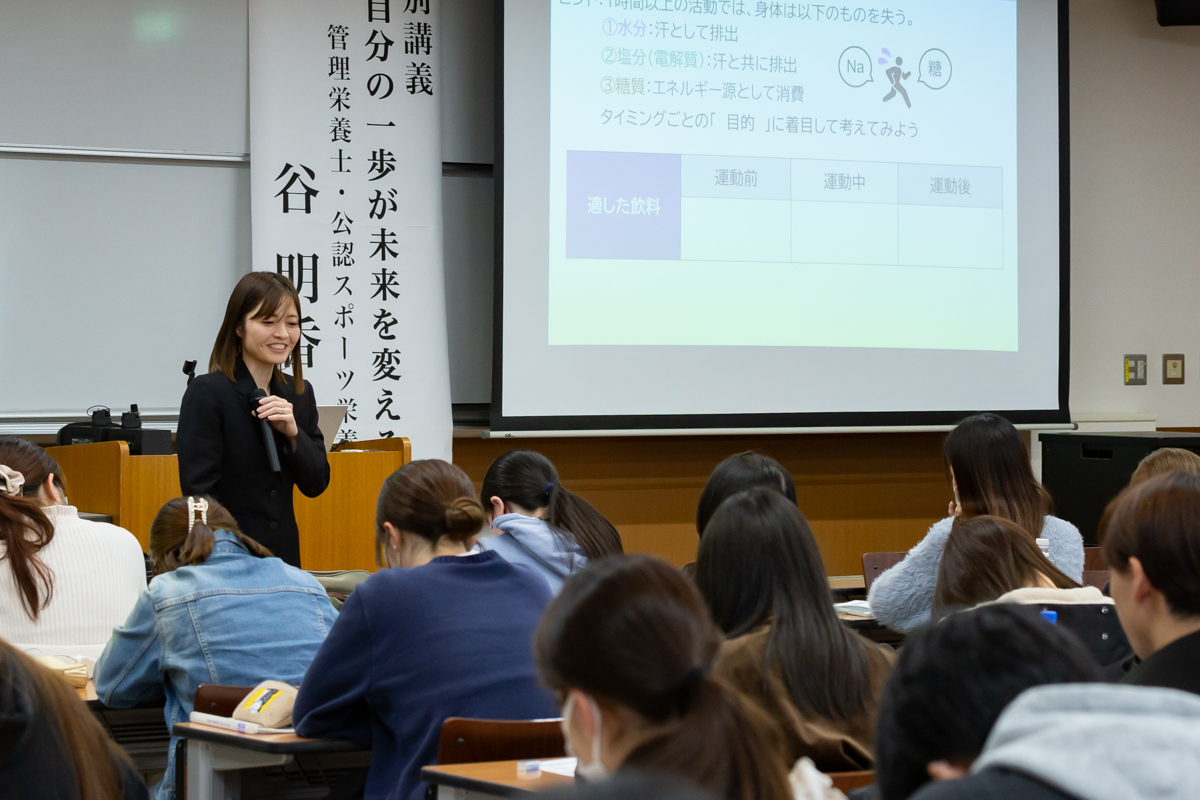 講義では、「未来の選択肢を強くする」をテーマに、谷先生の実体験を交えながら、キャリア形成に向けて大切にすべき視点や行動についてお話しいただきました。スポーツ選手向けセミナーで実際に行われているワークの体験や、アスリートへの栄養指導の難しさとやりがいなど、専門性の高い内容を分かりやすく紹介していただき、学生たちは熱心に耳を傾けていました。