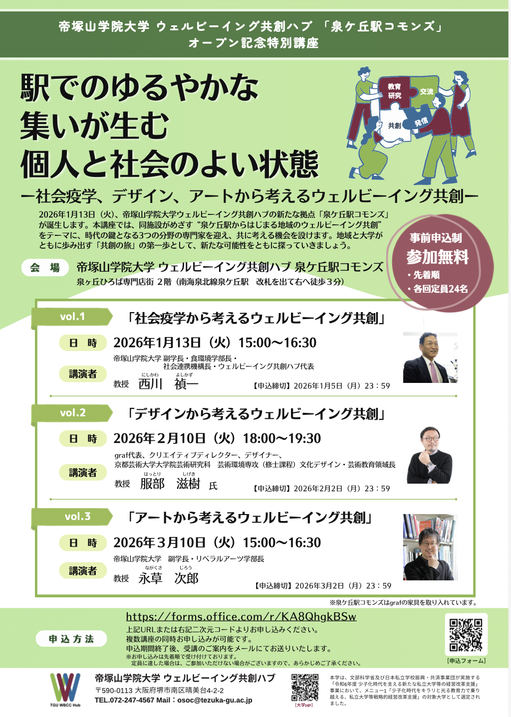 帝塚山学院大学 ウェルビーイング共創ハブ「泉ケ丘駅」のオープンを記念して、時代の鍵となる3つの分野の専門家を迎え、“泉ケ丘駅からはじまる地域のウェルビーイング共創“をテーマに、共に考える機会を設けます。参加無料(事前申込制/先着順/各回定員24名)となっております。ぜひご参加ください。