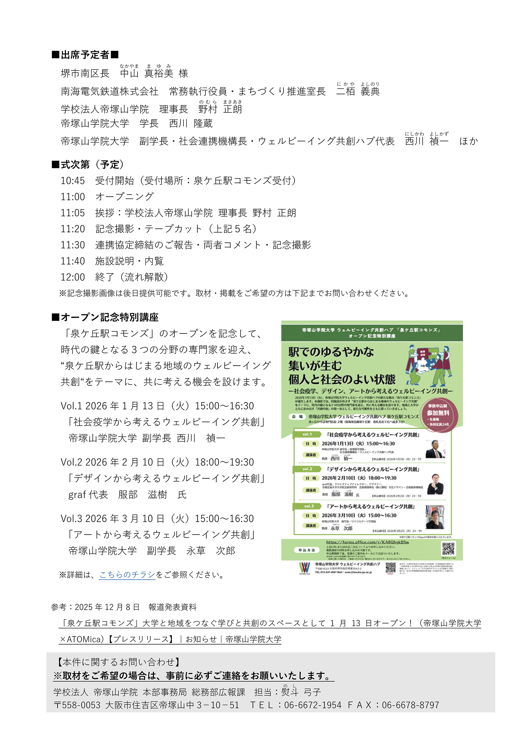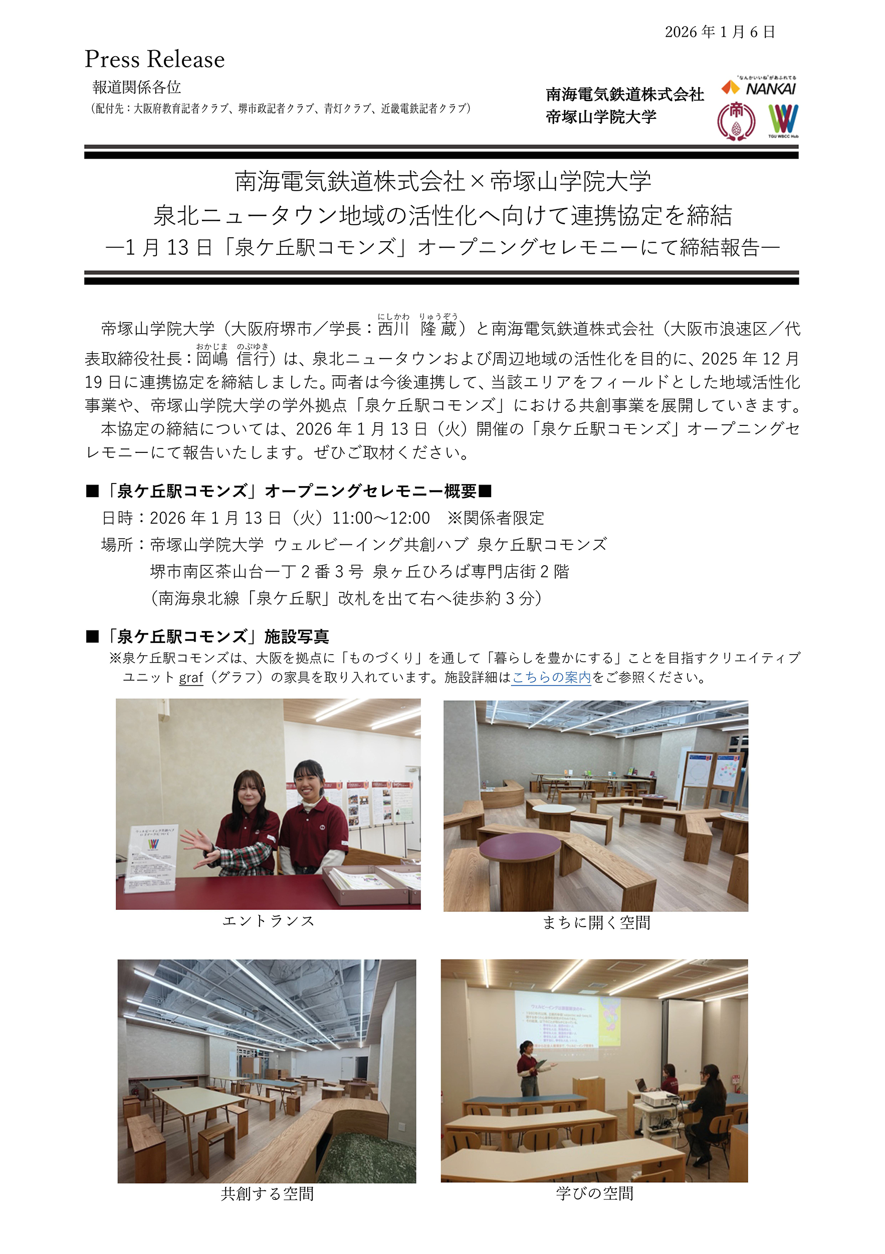 帝塚⼭学院⼤学と南海電気鉄道株式会社は、泉北ニュータウンおよび周辺地域の活性化を⽬的に、2025年12⽉19⽇に連携協定を締結しました。両者は今後連携して、当該エリアをフィールドとした地域活性化事業や、帝塚⼭学院⼤学の学外拠点「泉ケ丘駅コモンズ」における共創事業を展開していきます。本協定の締結については、2026年1⽉13⽇(⽕)開催の「泉ケ丘駅コモンズ」オープニングセレモニーにて報告いたします。ぜひご取材ください。