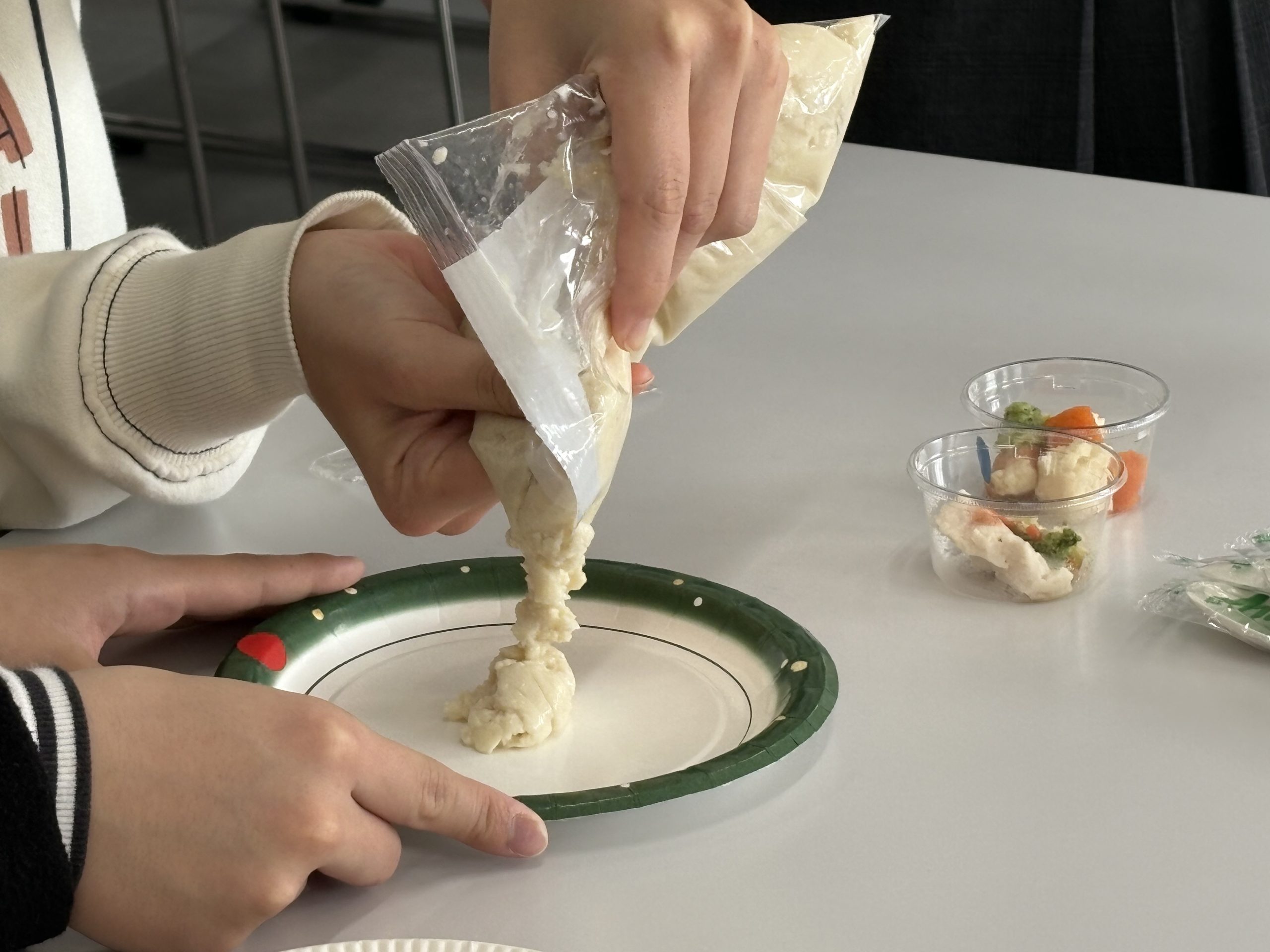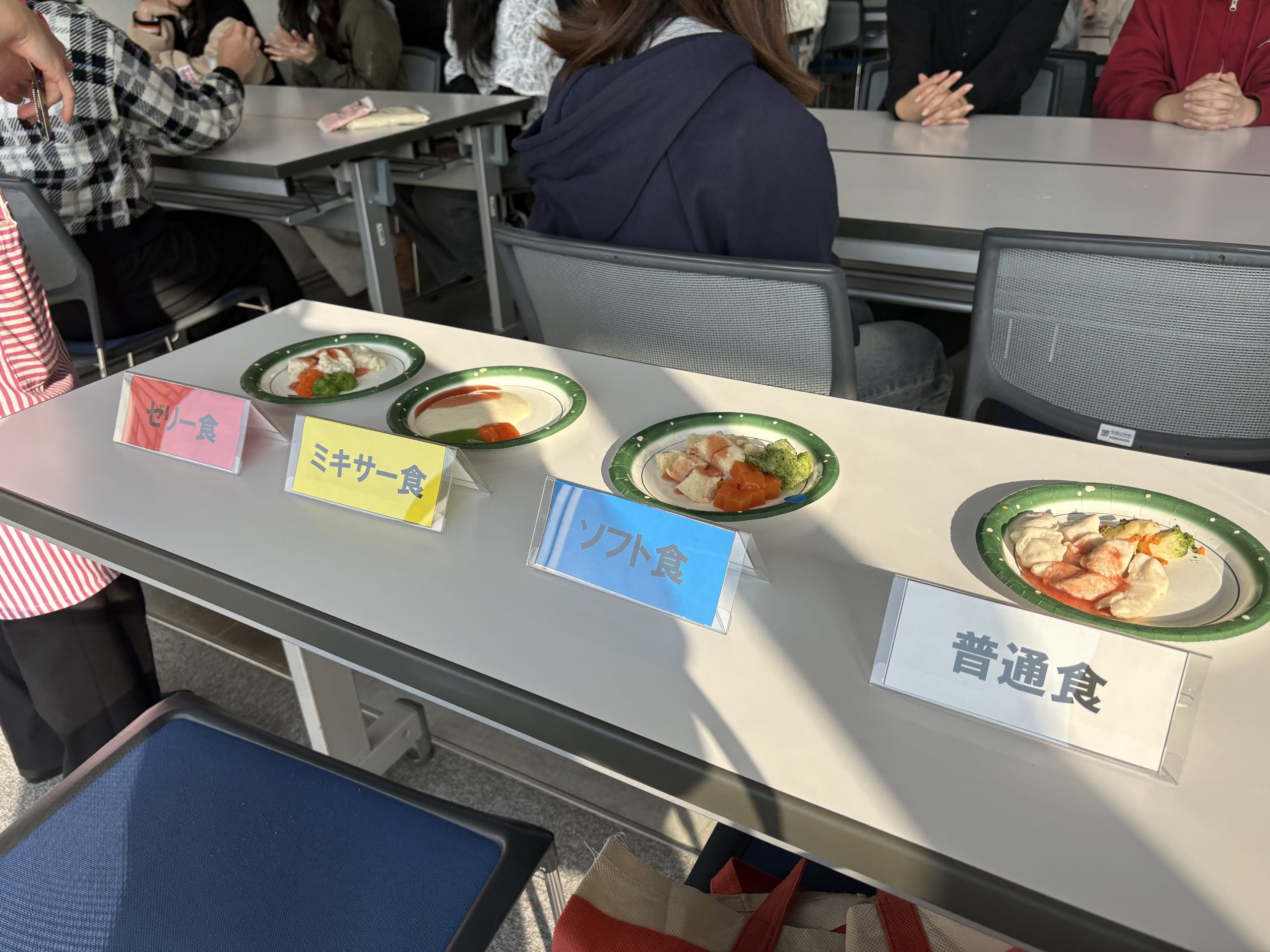 体験授業の中では、介護食についての講義から始まり、食事形態別のクックチル食品の盛り付け、試食会など、幅広く学ぶことができました。
