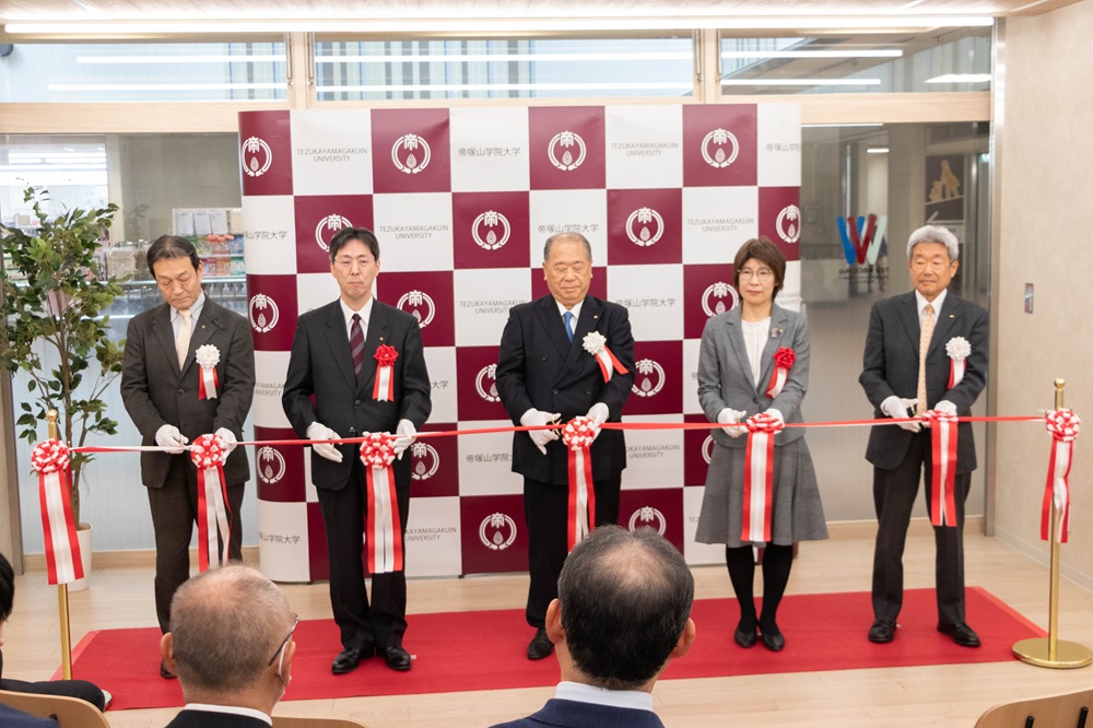 テープカットには、堺市南区長 中山真裕美様、南海電気鉄道株式会社 常務執行役員・まちづくり推進室長 二栢義典様のほか、本学からは理事長 野村正朗、学長 西川隆蔵、副学長・社会連携機構長 西川禎一が参加しました。
