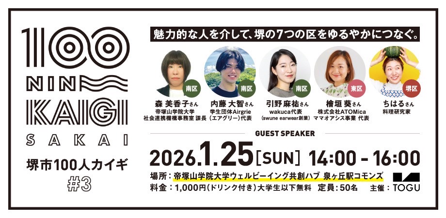 堺市で活動する「人」に焦点を当て、その生き方や思いに触れることで緩やかなコミュニティを作る「堺市100人カイギ」は、第3回となるイベント(Vol.3)を2026年1月25日(日)、泉ヶ丘ひろば専門店街内の「帝塚山学院大学ウェルビーイング共創ハブ 泉ケ丘駅コモンズ」にて開催いたします。