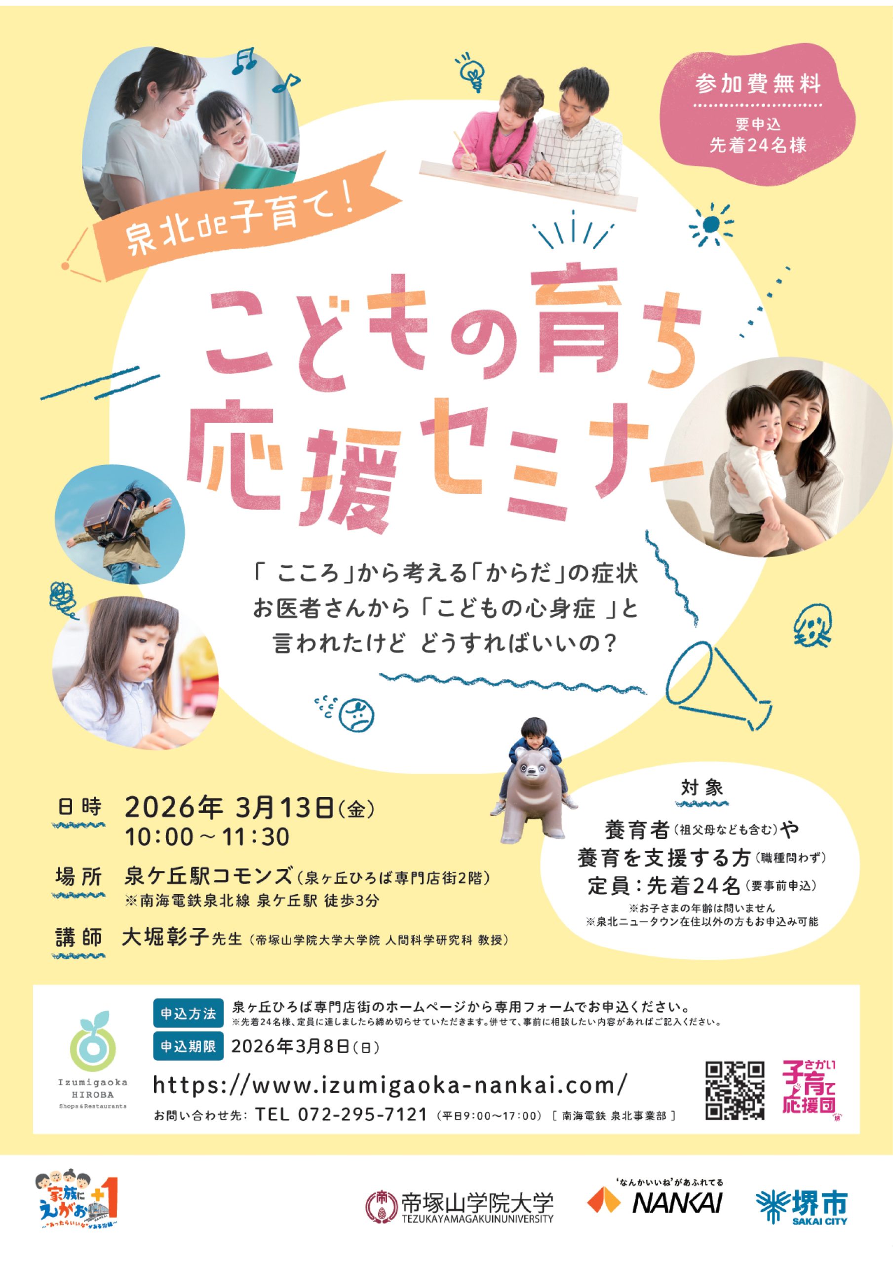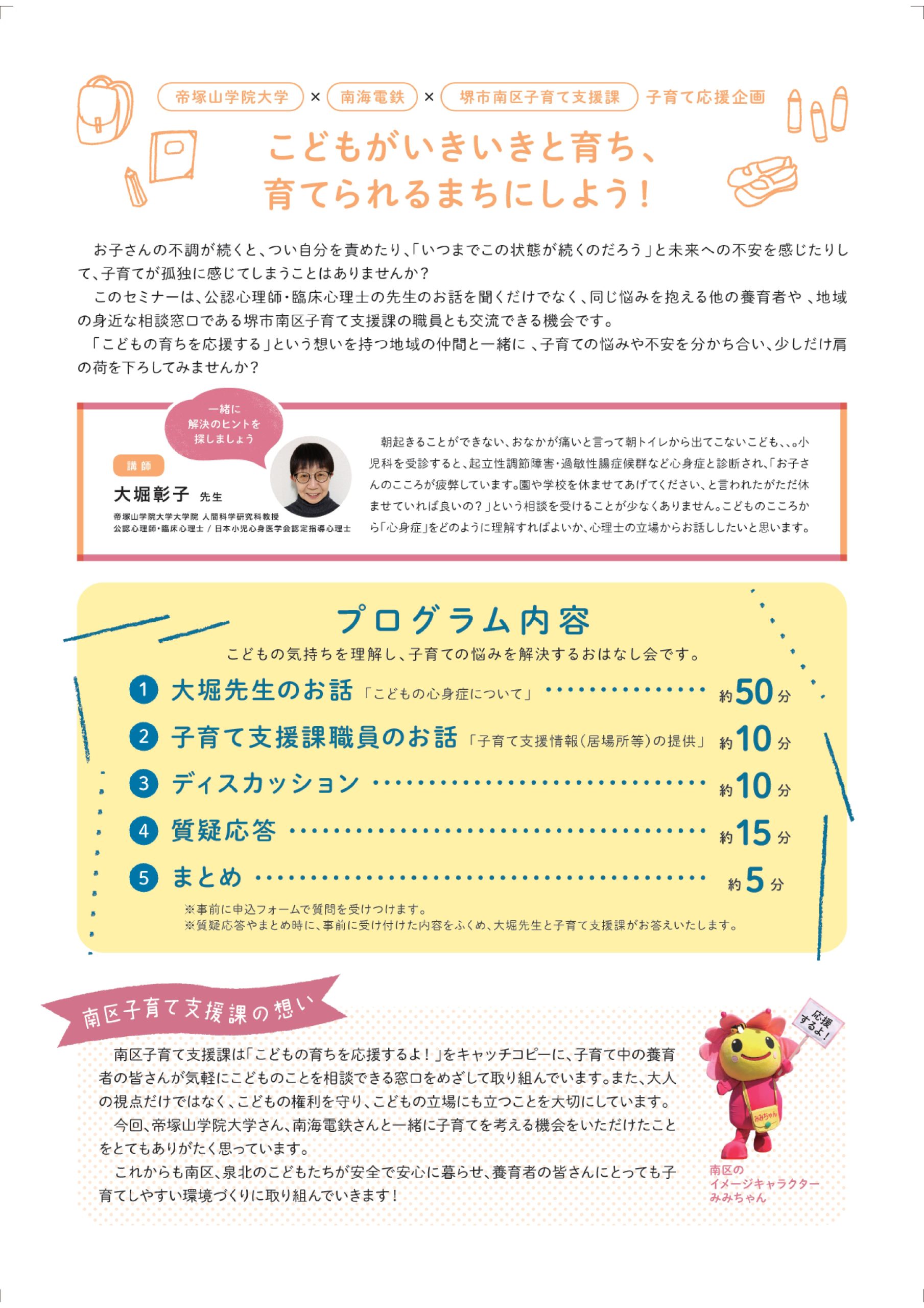 “ こどもがいきいきと育ち、育てられるまちにしよう!”をテーマに、南海電鉄、堺市南区子育て支援課、本学が共催にて実施する子育て応援企画「泉北de子育て!こどもの育ち応援セミナー」を以下の日程で開催いたします。