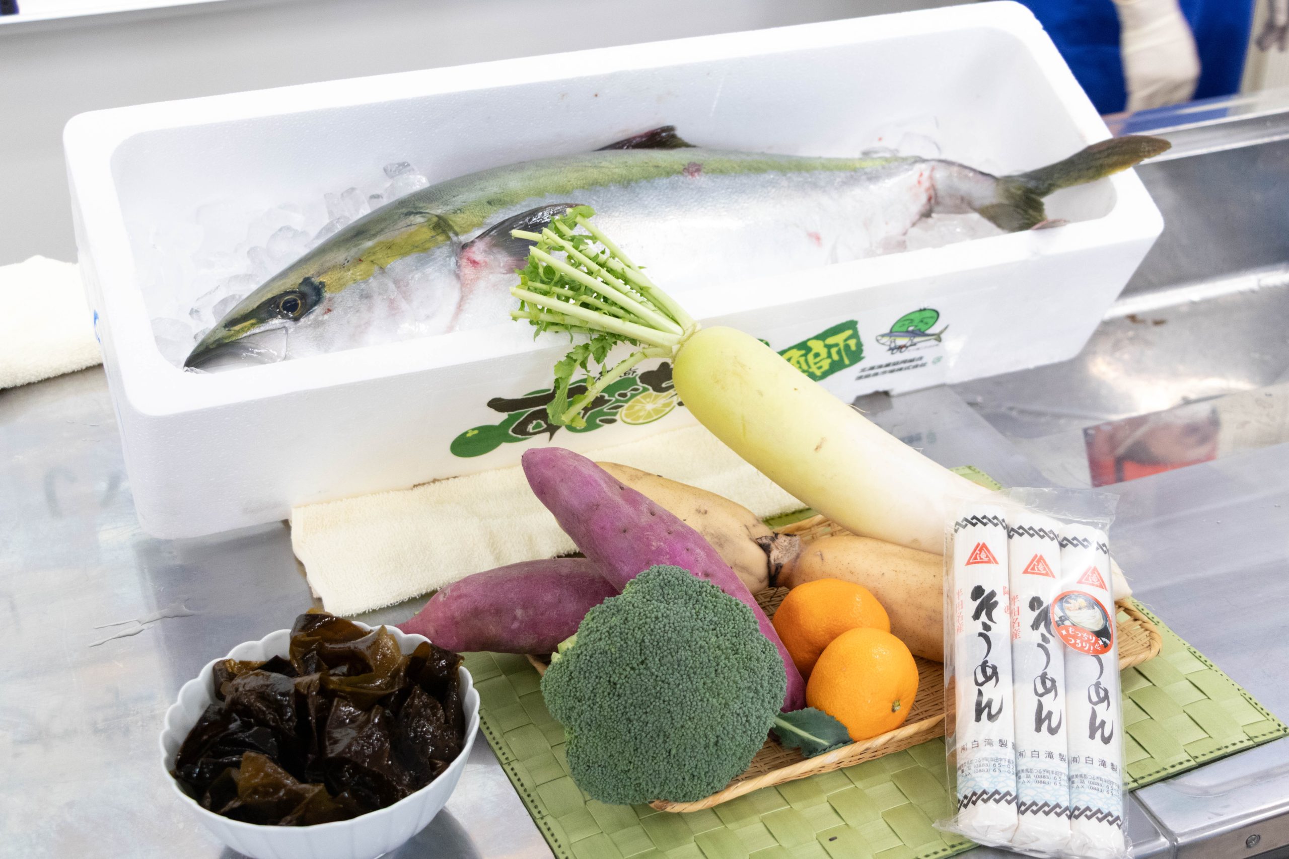 今年で4回目の開催となるこの取り組み。今回は徳島県の特産品である「すだちブリ」をご提供いただき、5~6kgという大きな魚を調理しました。また、徳島県様より鳴門金時やブロッコリー、レンコン、半田そうめん、勝浦貯蔵みかんなど、色々な食材をご提供いただきました。