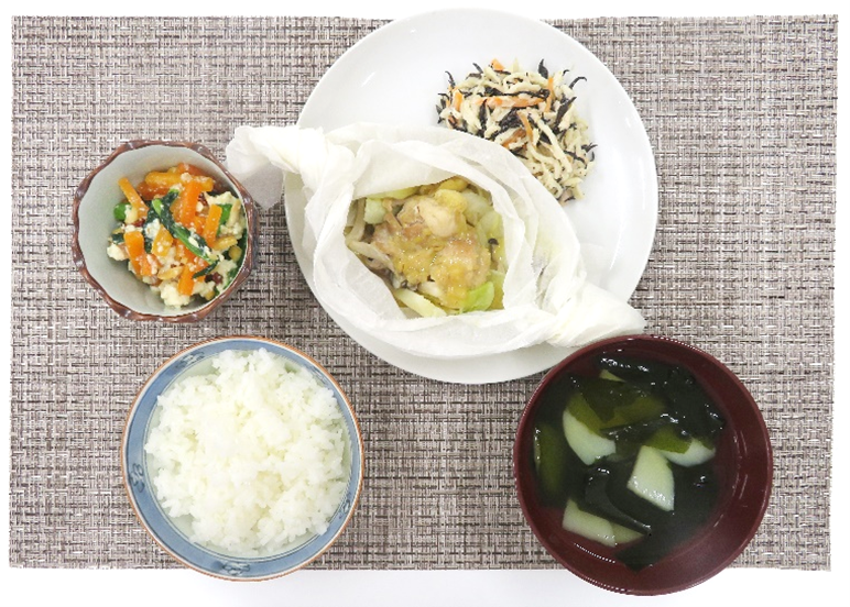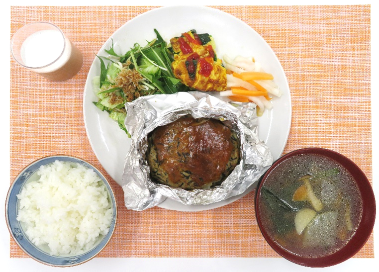 この定食は、しっかり噛んで食べる食材を使い、自然と噛む回数が増えるよう工夫しました。1食で1日の目標量の約7割の食物繊維がとれ、腸内環境を整える助けになります。さらに葉酸やカルシウムも補え、歯や骨の健康を意識した、毎日の食事に取り入れやすい献立です。歯や骨の健康を意識した、体に優しい定食です。