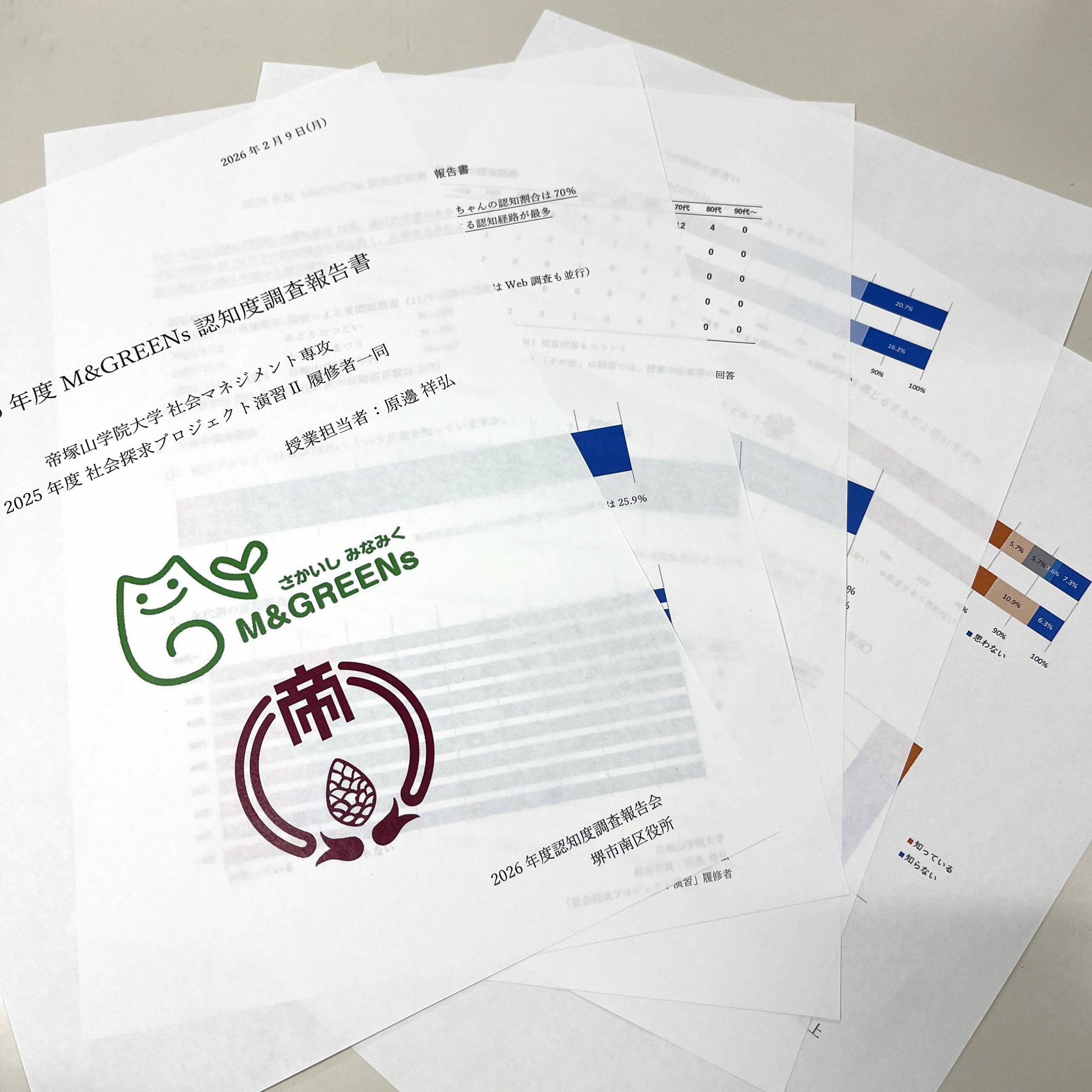 リベラルアーツ学科の専門科目「社会探求プロジェクト演習Ⅰ/Ⅱ」では、堺市南区役所企画総務課の依頼を受けて、「南区魅力発信プロジェクト」の一環として堺市南区ブランドM&GREENsの認知度調査を実施しています。