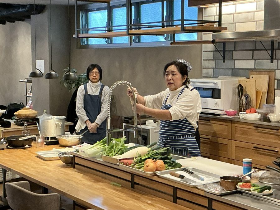 午後は快晴の空の下、参加者のみなさんと運営スタッフが共に緑道を歩きながらspace.SUEMURAへ移動し、料理研究家で一般社団法人日本おばんざい協会 代表理事の川淵智子先生による調理デモンストレーションを実施しました。