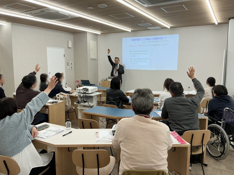 午前のプログラムは、泉ケ丘駅コモンズにて、参加者同士の自己紹介後、帝塚山学院大学 副学長・社会連携機構長・ウェルビーイング共創ハブ代表の西川禎一教授による「ウェルビーイングについて」の講義により、ウェルビーイングに対する理解を深めました。
