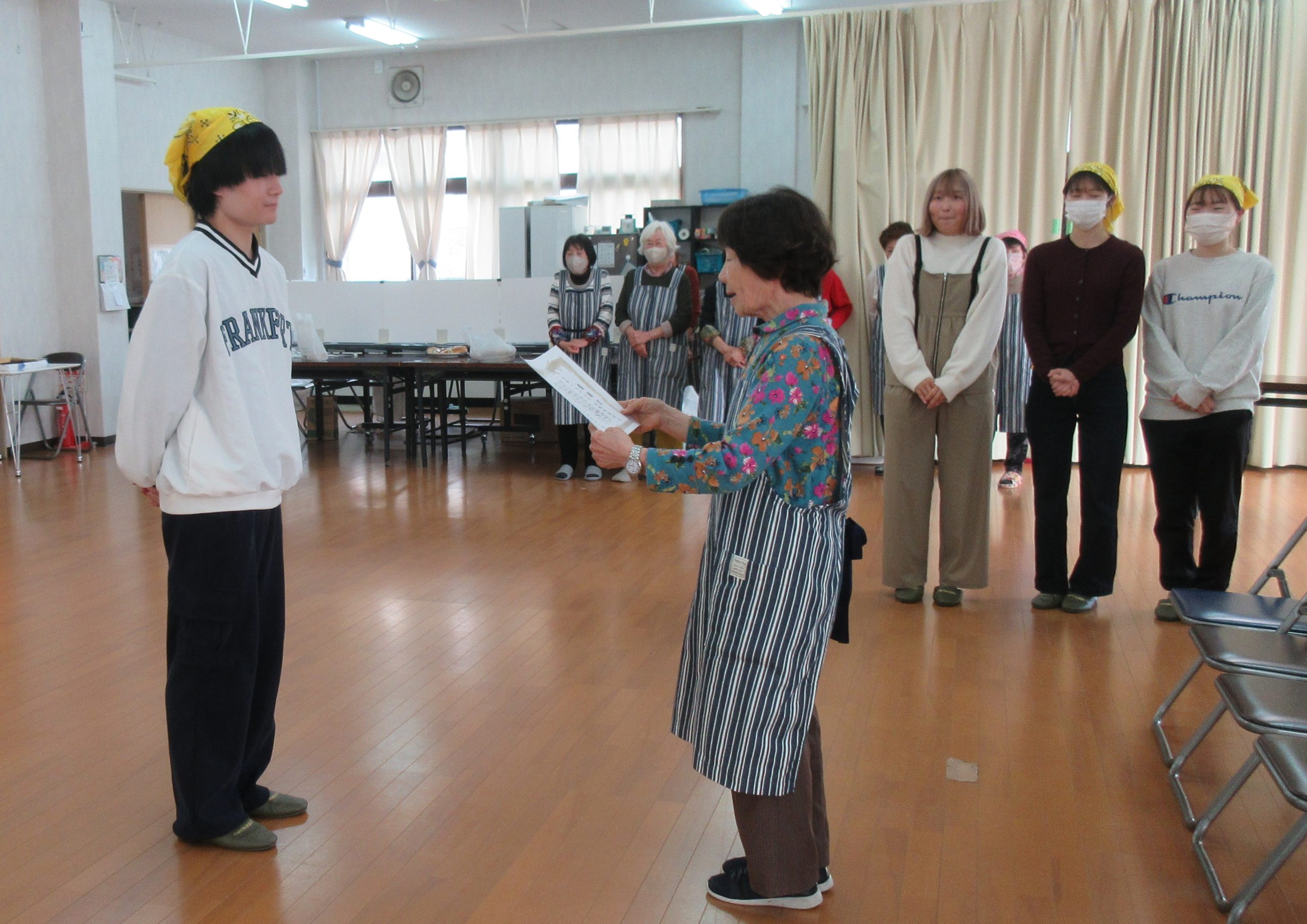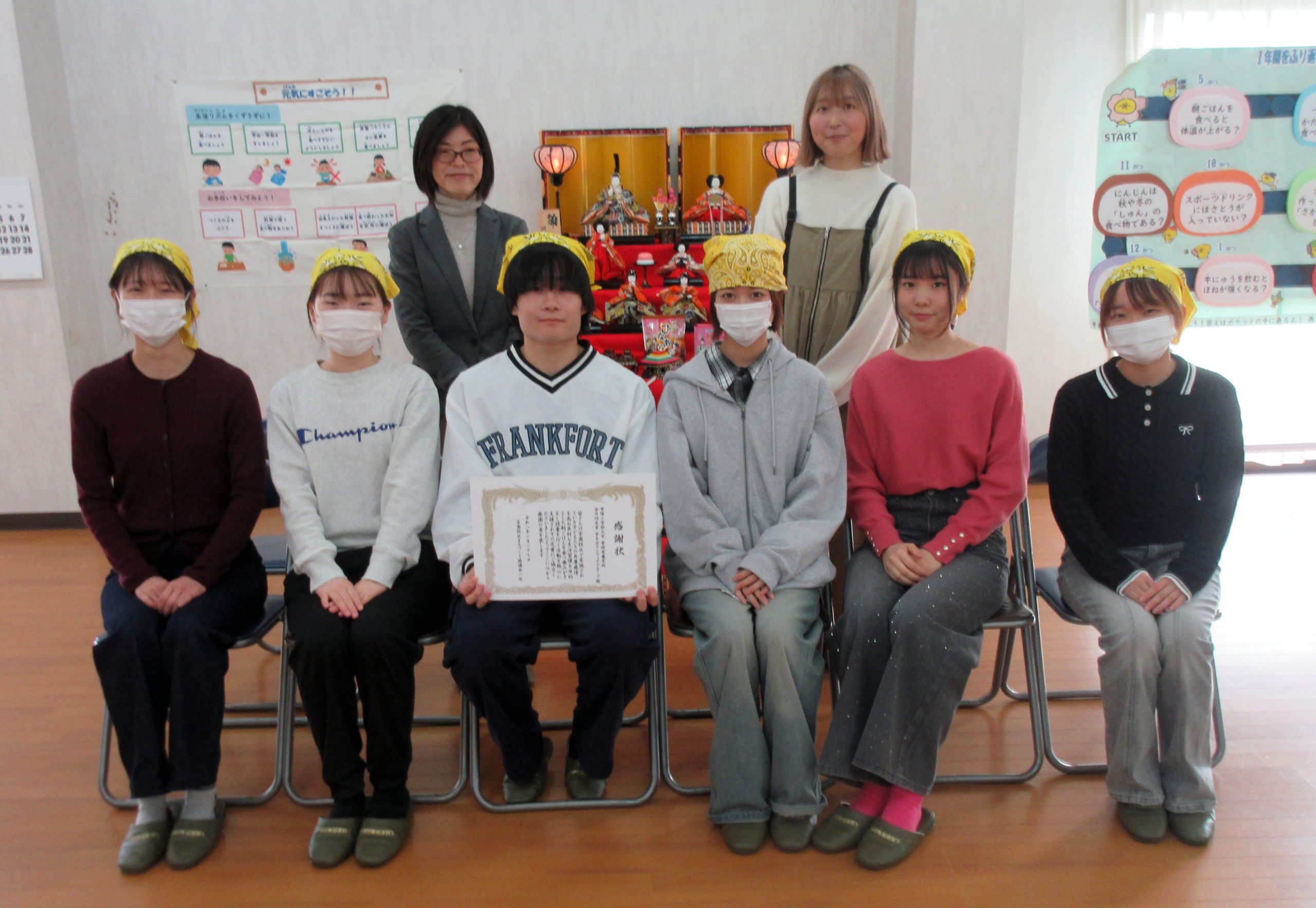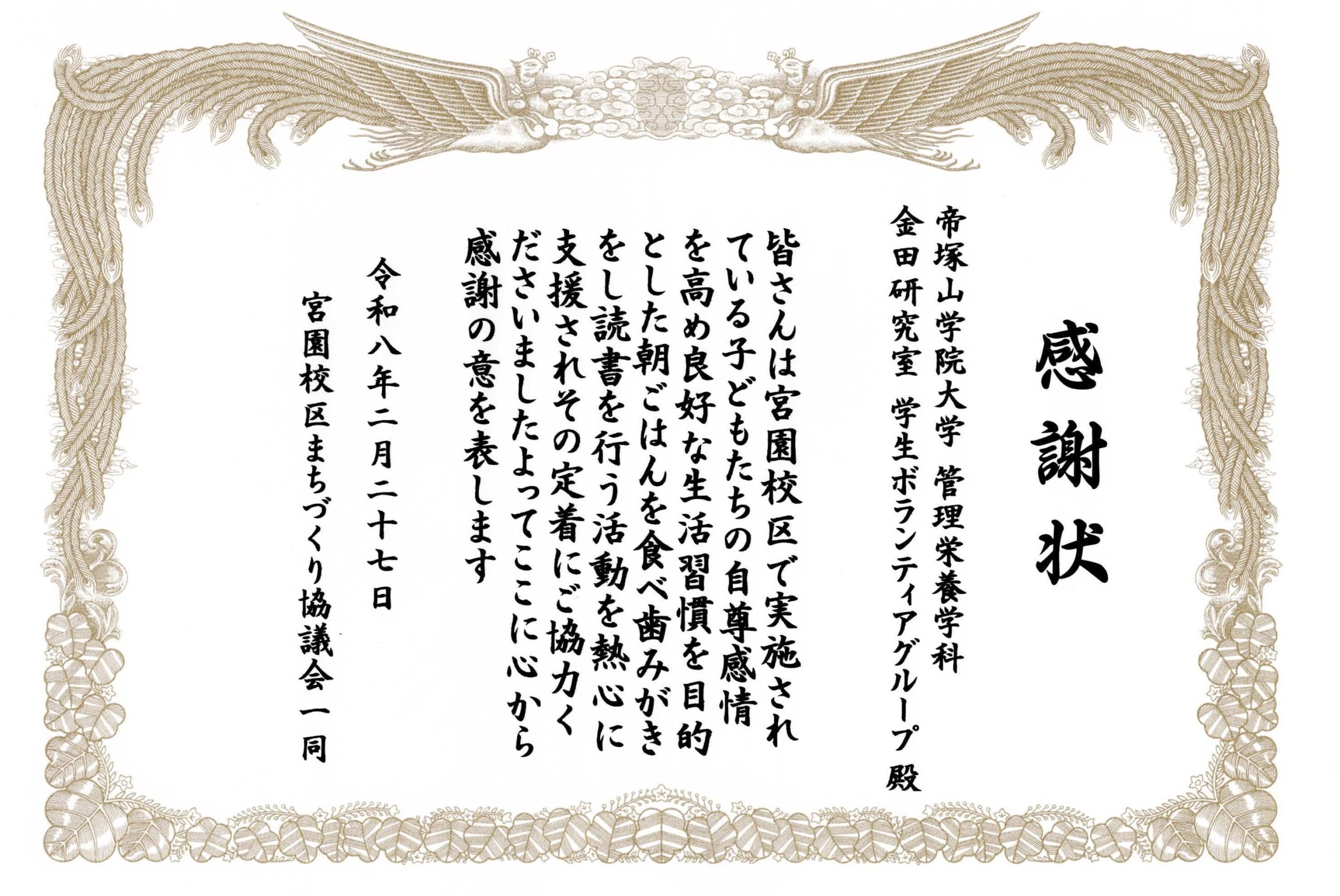 児童とコミュニケーションを取りながら楽しく安心できる食環境づくりを行うとともに、食育ポスターの掲示といった健康づくり支援を今年度も行い、本取組みに対して、宮園校区まちづくり協議会より感謝状を授与されました。毎月参加している学生からは「将来子供に関わる仕事がしたいと考えているため、教科書では学ぶことができない日常の子どもの様子がよく分かり、勉強になる」「地域に根付いた健康づくりを体験することができた」などといった意見が寄せられました。