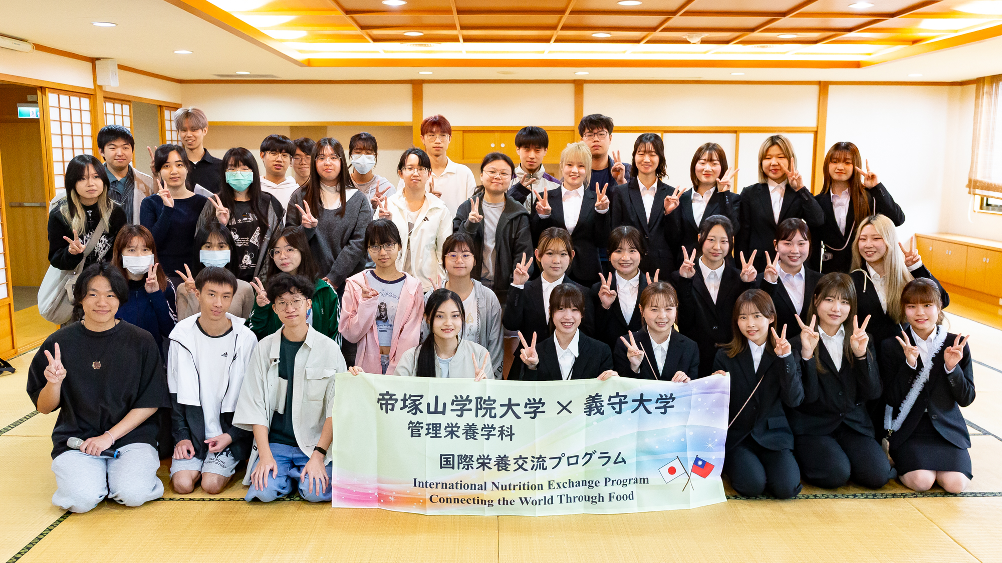 本研修では、義守大学の応用日本語学科、医科学・バイオテクノロジー学科、栄養学科の3学科の学生との交流を通じて、文化や食習慣の違いを互いの視点から学び、活発な意見交換を行いました。応用日本語学科では、本学学生が日本文化を紹介し、質疑応答を通じて交流を深めました。学内には茶室や華道の施設など日本文化を学ぶ環境が充実しており、台湾の学生の日本文化への高い関心を実感する機会となりました。