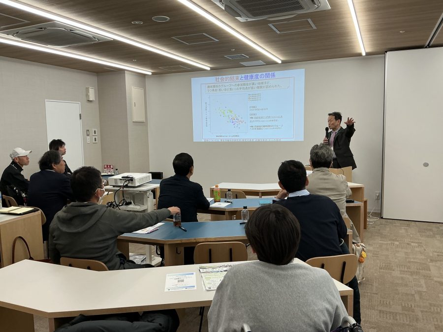 午前は、参加者同士のアイスブレーキングからスタート。続いて、帝塚山学院大学 副学長・社会連携機構長・ウェルビーイング共創ハブ代表の西川禎一教授より「人々の絆と健康 ウェルビーイング共創ハブの役割」についての講義を行いました。