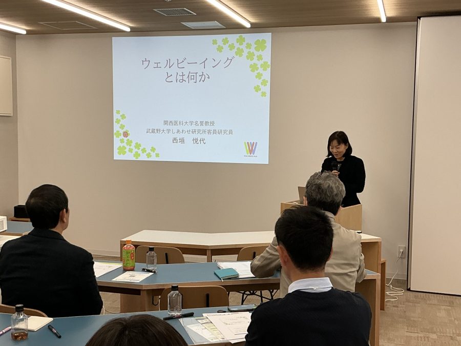 続いて、関西医科大学名誉教授 武蔵野大学しあわせ研究所客員研究員の西垣悦代氏より「ウェルビーイングとは?」について講義をしていただき、ウェルビーイングの基本的な概念や考え方を学びました。