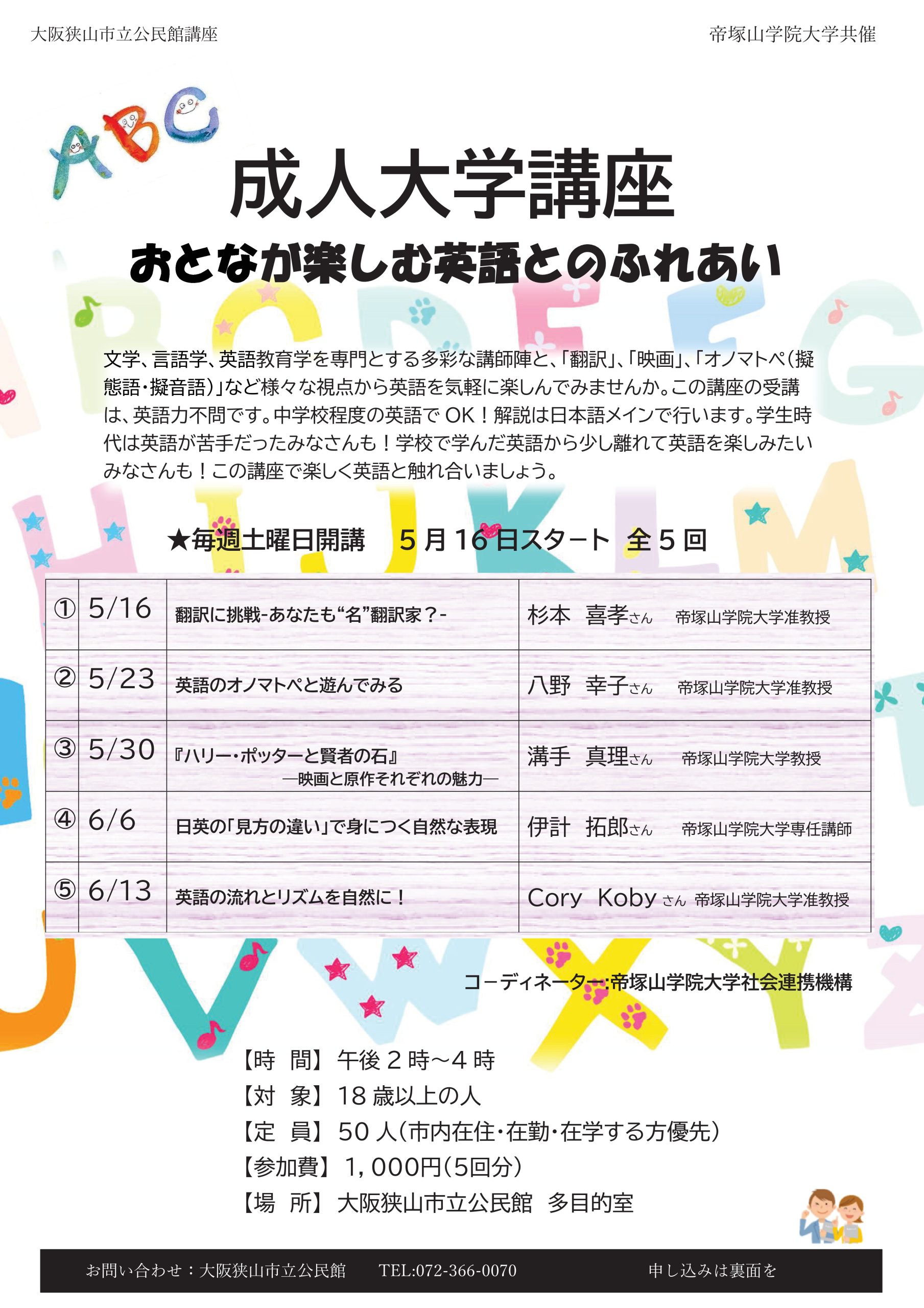 大阪狭山市立公民館 ・帝塚山学院大学共催「成人大学講座」を開催いたします。 詳しくは、大阪狭山市立公民館の講座案内をご覧ください。 お申し込みやお問い合わせに関しましては、大阪狭山市立公民館までご連絡いただきますようお願い申し上げます。