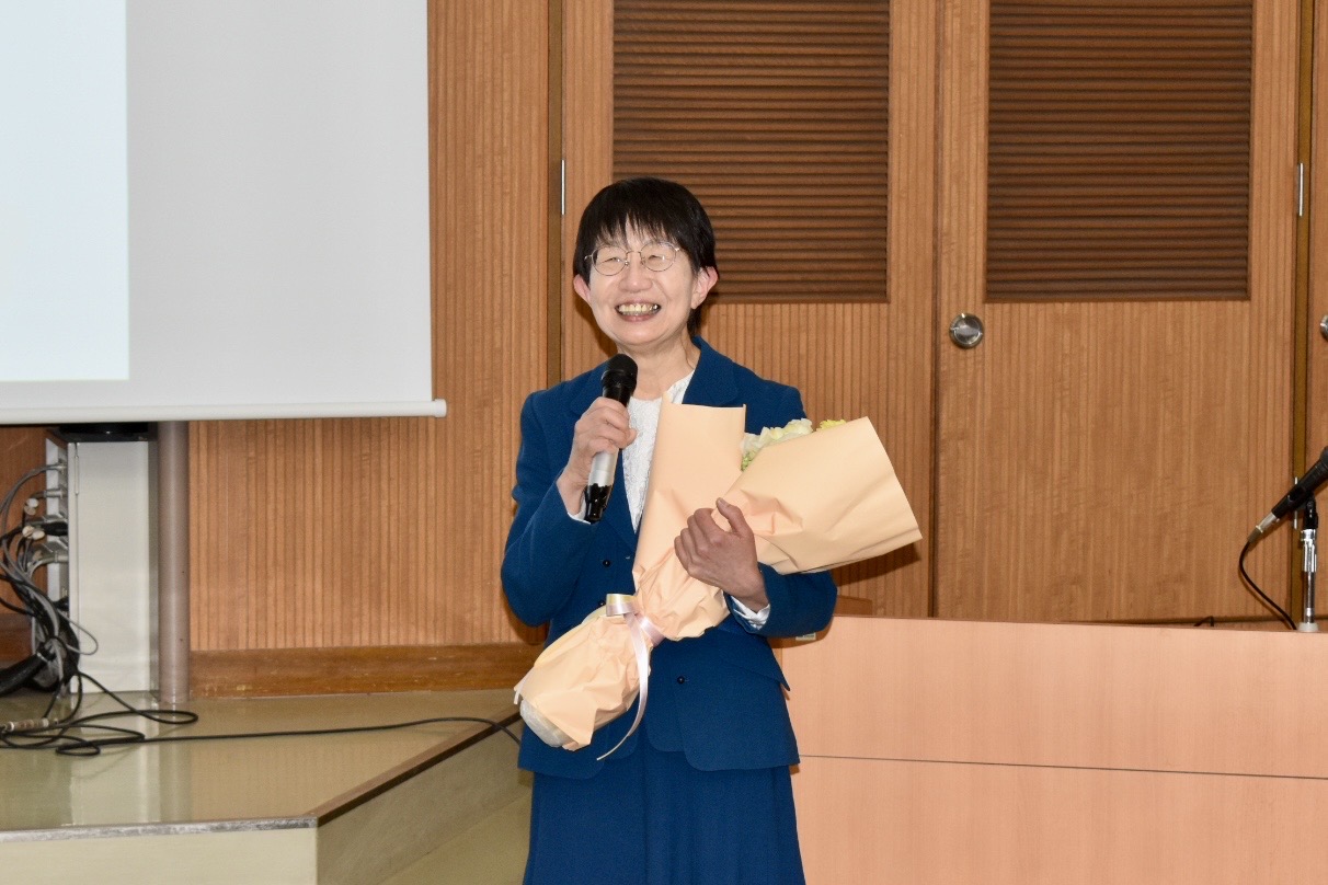 講義終了後には花束贈呈が行われ、会場は受講者からの大きな拍手に包まれました。大堀教授は、本学名誉教授、非常勤講師として、今後も引き続き、大学院の心理専門職養成や心理実践実習に関わります。
