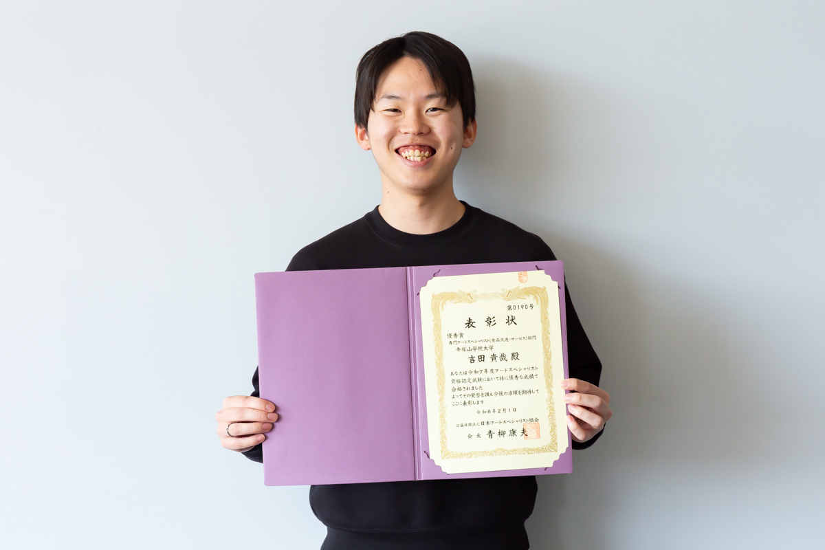 令和7年度フードスペシャリスト資格認定試験において、食物栄養学科 管理栄養士課程※4年(受験時3年)の吉田貴哉さんが、専門フードスペシャリスト(食品流通・サービス)資格部門において成績優秀者として認められ、公益社団法人 日本フードスペシャリスト協会より特別表彰を受賞しました。